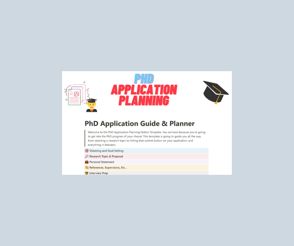 With the PhD Application Guide and Planner, built within Notion, you'll be able to access all that you need for crafting a competitive application far more affordably than an admissions consultant.